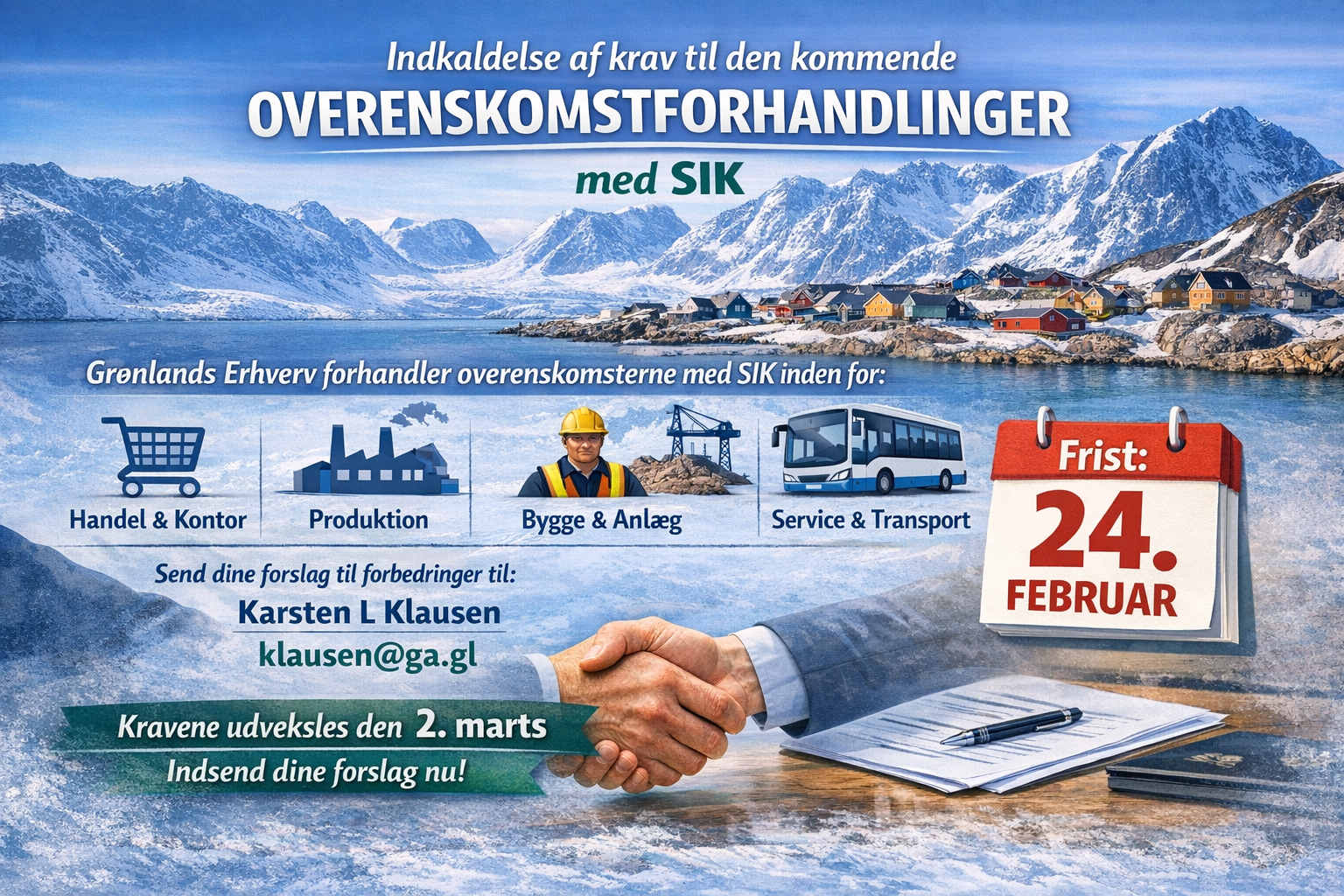 Grønlands Erhverv skal forhandle overenskomsterne med SIK inden for handel og kontor, produktion, bygge- og anlægsvirksomhederne samt Service og transportområdet.